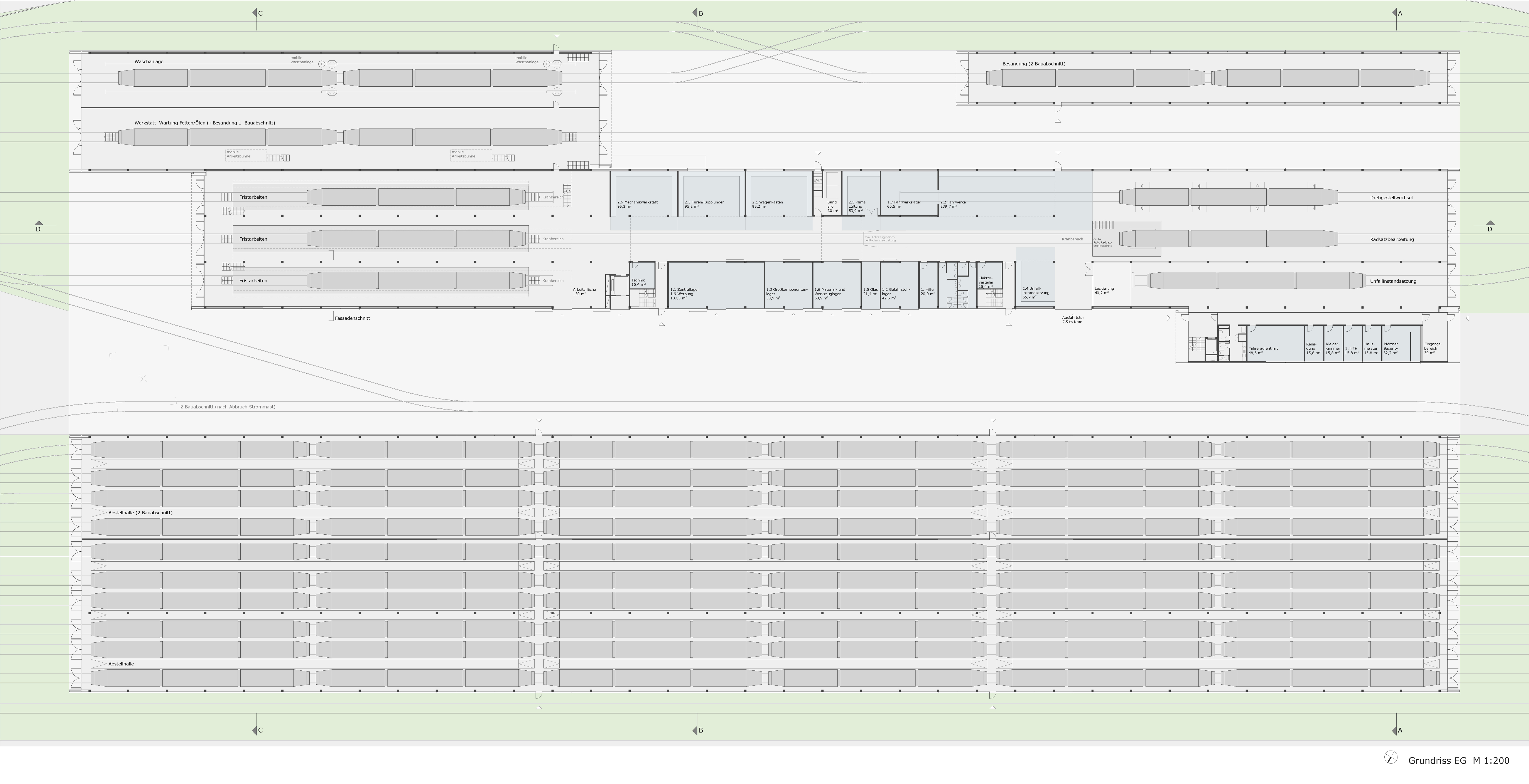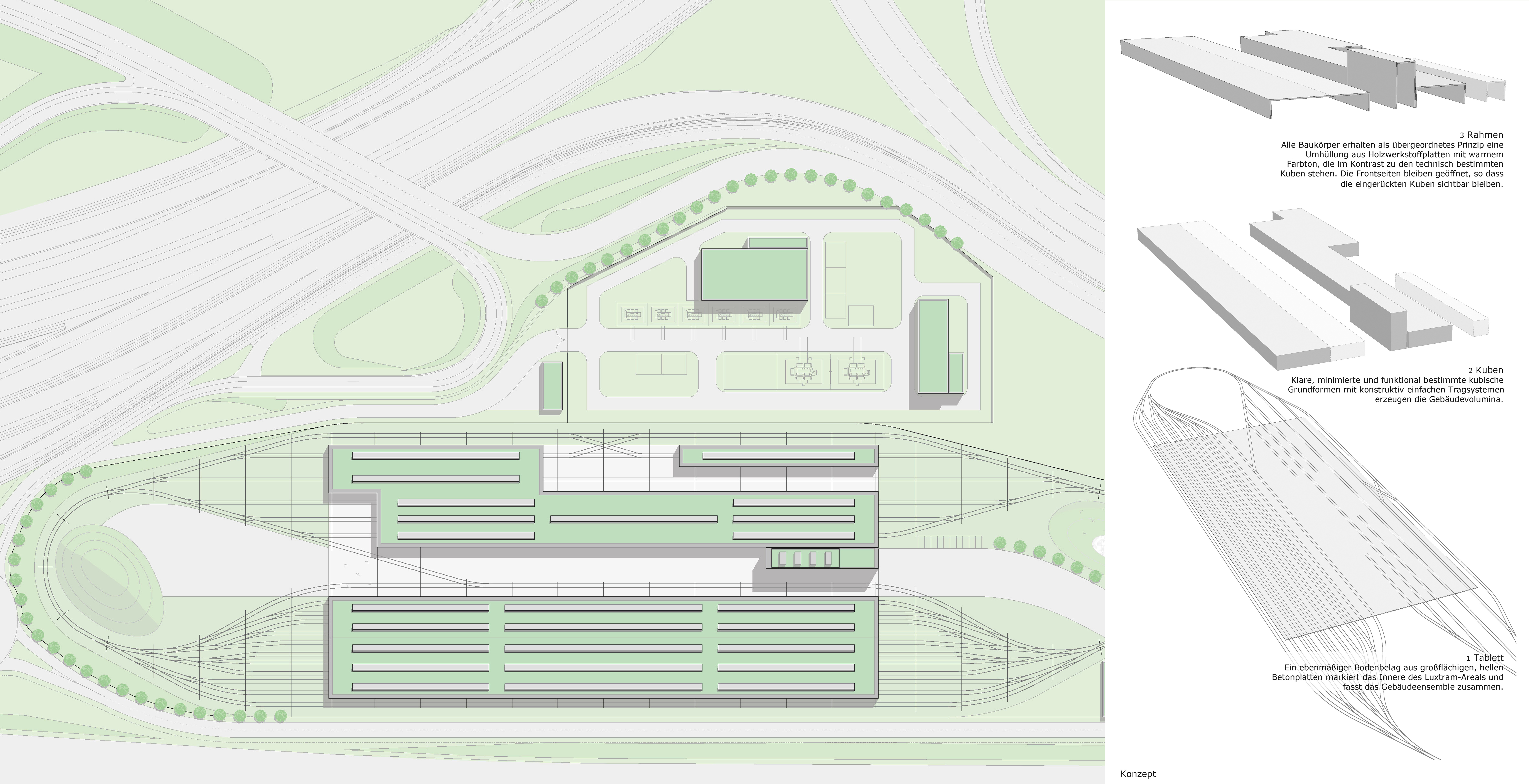 Auf einem Gelände am Rand von Luxembourg Kirchberg entstehen in kompakter Figur Abstell- und Werkstatthallen sowie die Verwaltung für die neu gegründete Straßenbahngesellschaft Luxtram.