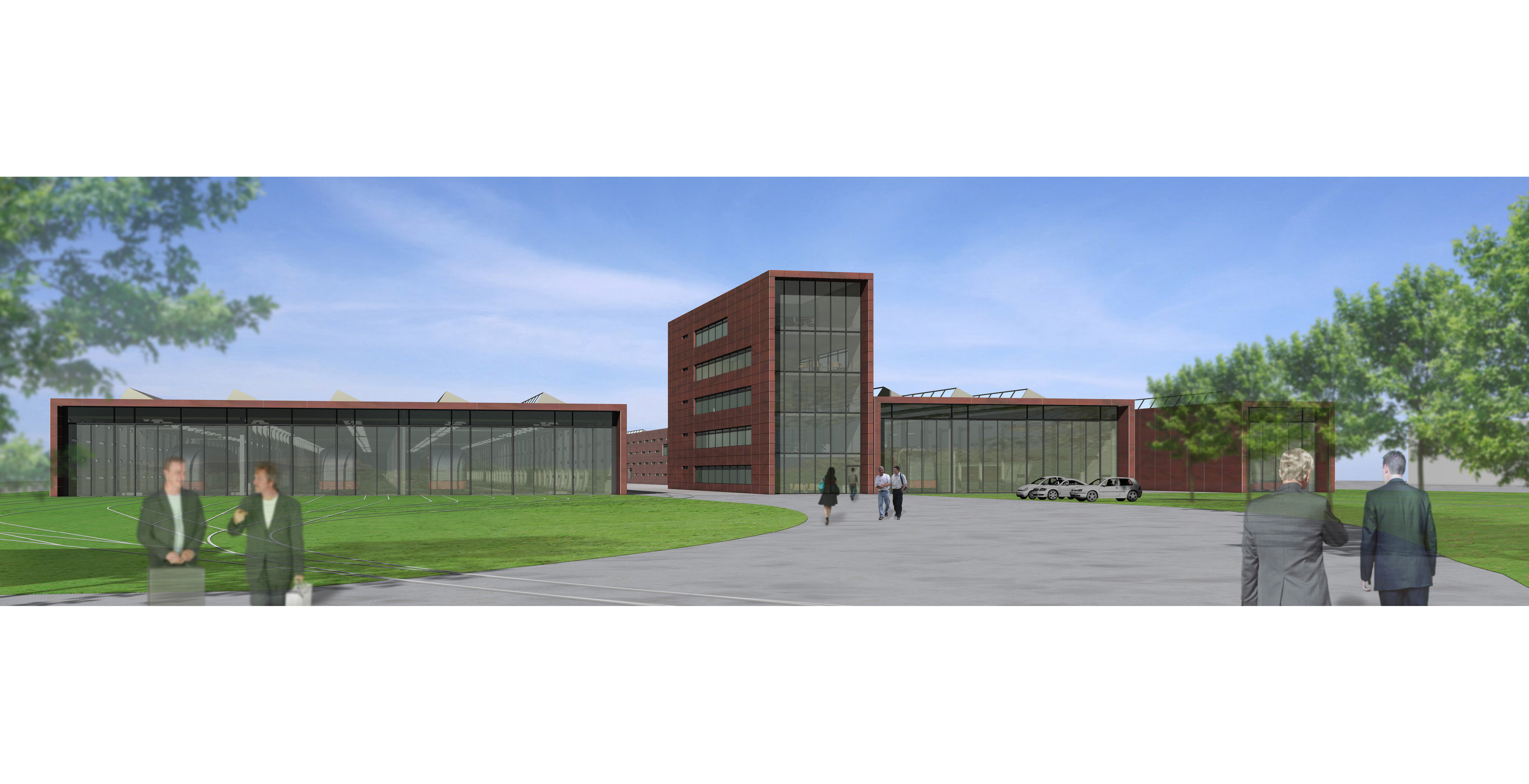 Die Gebäudegruppe zeichnet sich durch klare Grundformen mit einer einheitlichen Gestaltung aus übergestülpten warmtonigen Holzverkleidungen (als Bezug zum benachbarten Wald) und zurückversetzten verglasten Fronten aus. Einfache Tragsysteme zur stützenfreien Überspannung der Hallenräume schaffen Flexibilität für die Nutzflächenaufteilung.
