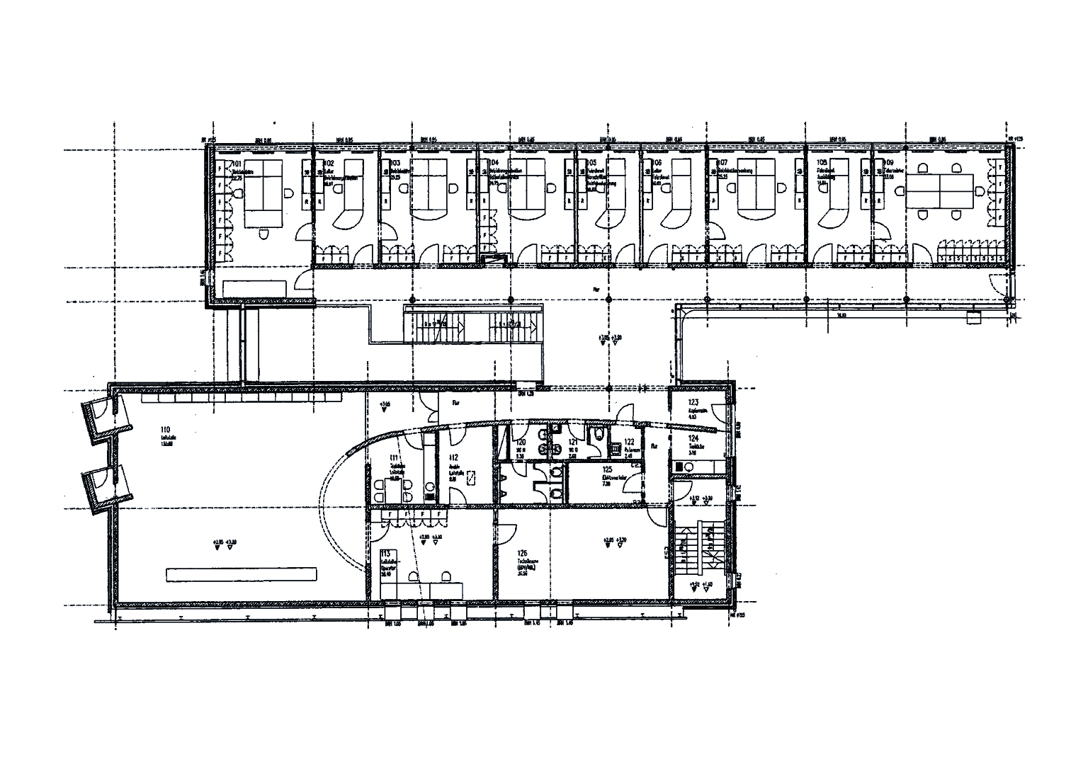 Das Betriebsdienstgebäude beherbergt nun neben der Leitstelle auch Räume für die Fahrerschulung und Büros der Betriebsabteilung. Eine dreigeschossige innere Halle mit Dachverglasung erschließt den Bürotrakt einerseits und die zweigeschossige Leitstelle samt zugehörigen Technikräumen auf der anderen Seite.