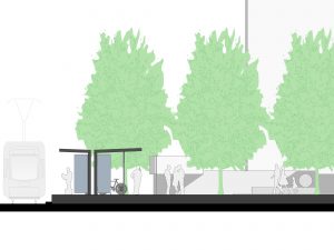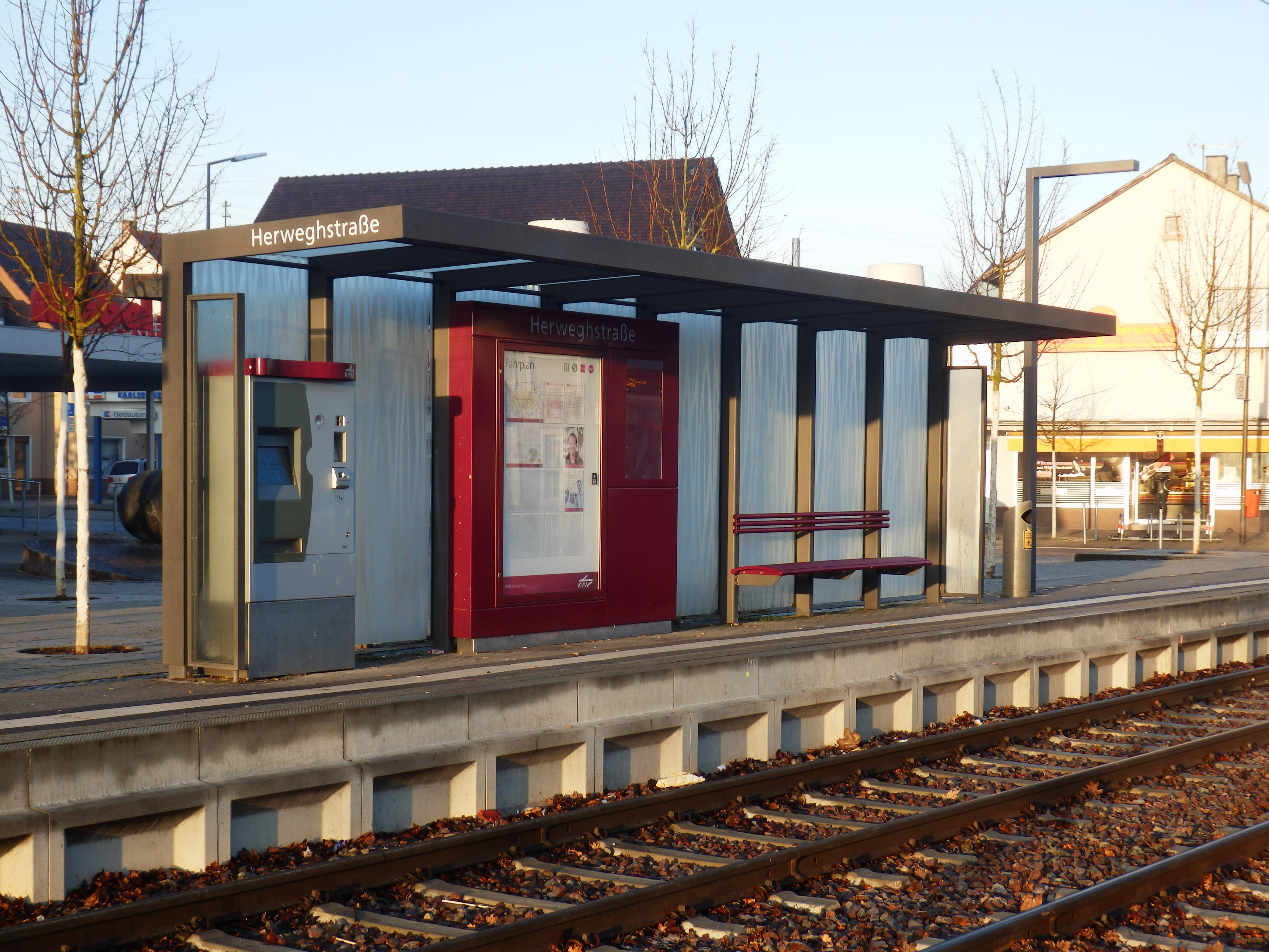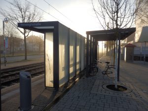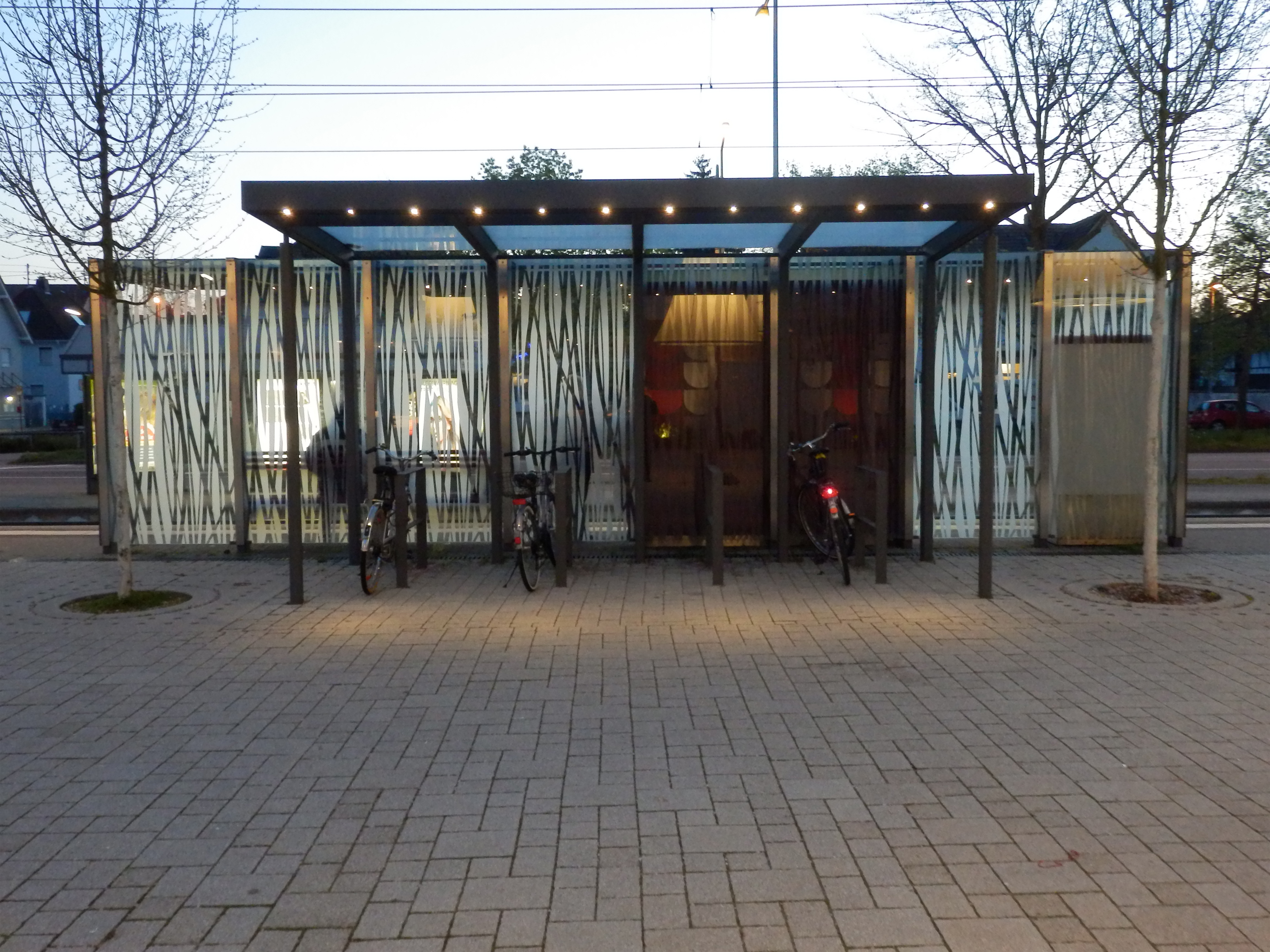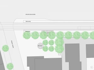Die Rücken an Rücken stehenden Dächer für Haltestelle und Fahrradständer markieren die Grenze zwischen Bahnsteig- und Platzbelag. Sie reihen sich in den Rhythmus formal verwandten Bahnsteigleuchten und neu gepflanzten Bäumen ein. Im Gegensatz dazu wird die Platzbeleuchtung mit spielerisch anmutenden Stehleuchten ausgeführt.