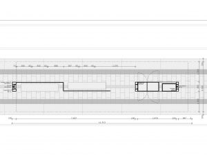 Auf den Tragbügel sind im Abstand von 1,00 m Dachspanten aufgeschweißt, die die Dachverglasung tragen. Die Gläser sind leicht nach innen geneigt und entwässern in eine Rinne, die in den Tragbügel integriert ist. Unterseitig ist in den Bügel die Beleuchtung integriert (LED-Streifen hinter einer mattierten Plexiglasabdeckung), so leuchtet der Tragrahmen von innen heraus.