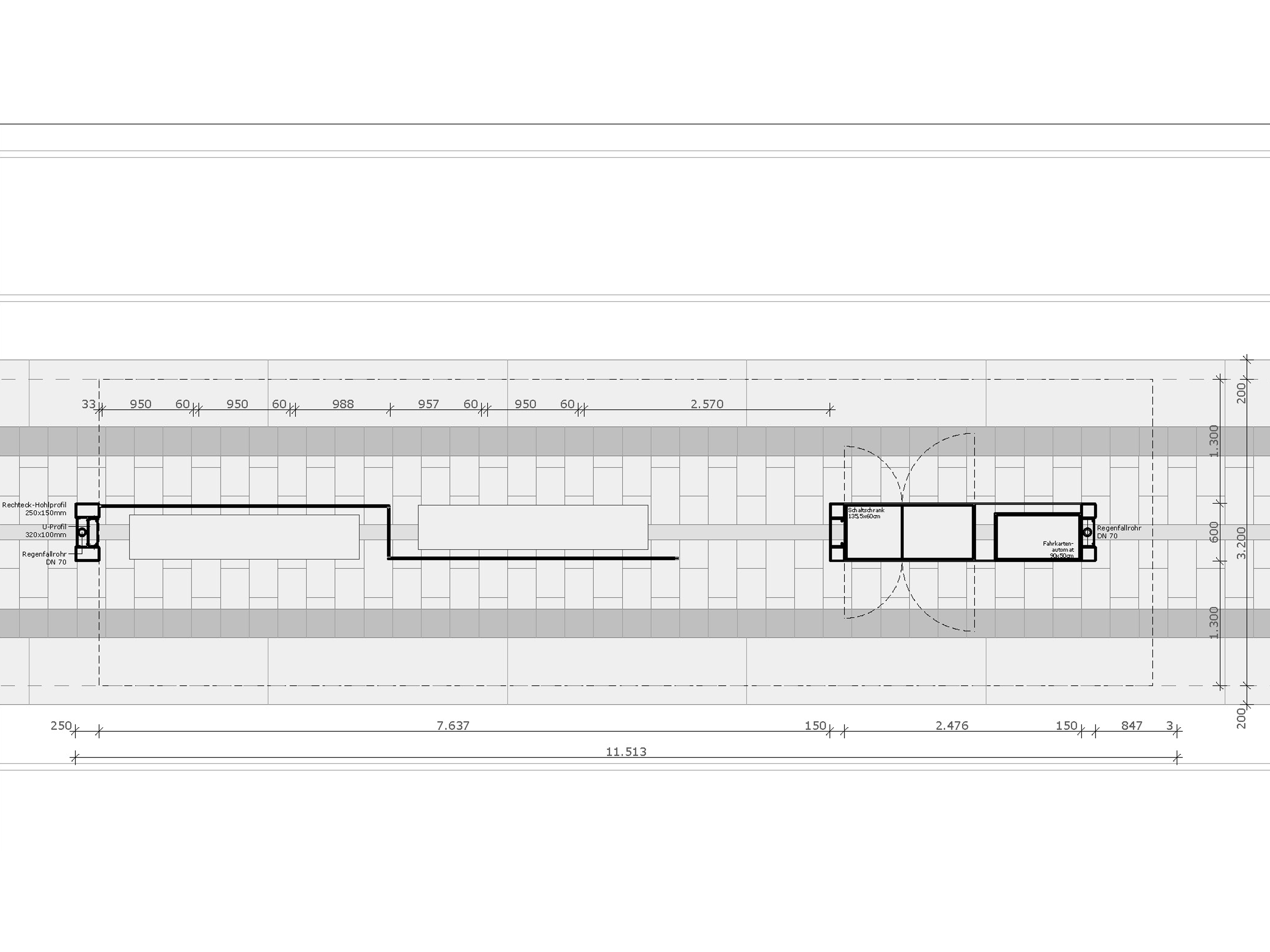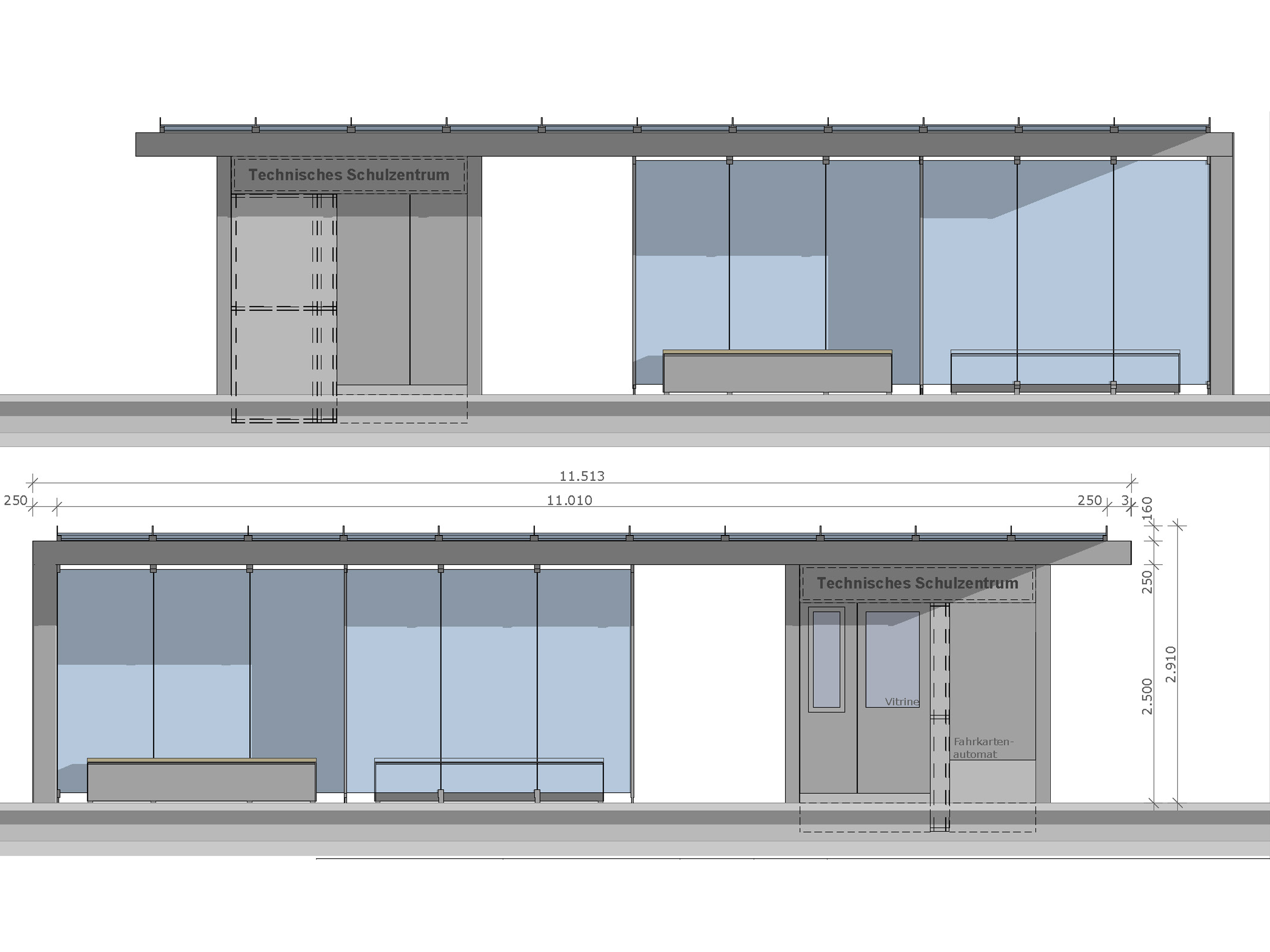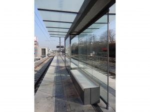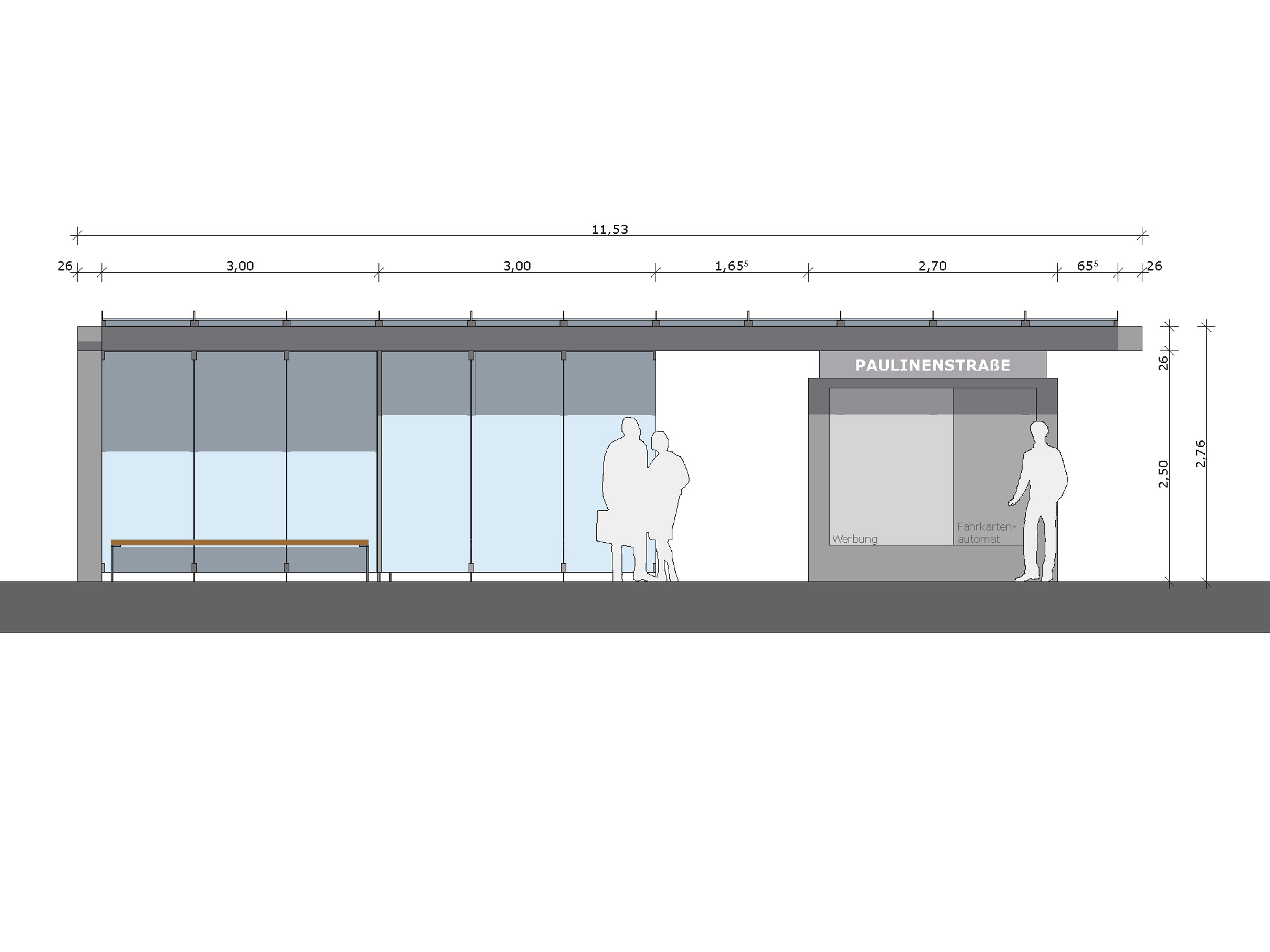 Unter den Bügel sind Sitzbänke aufgestellt, dahinter vertikale Glasscheiben als Witterungsschutz. Auch diese Einbauten müssen sich addiert mit 60 cm Bautiefe begnügen.