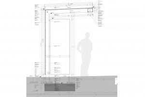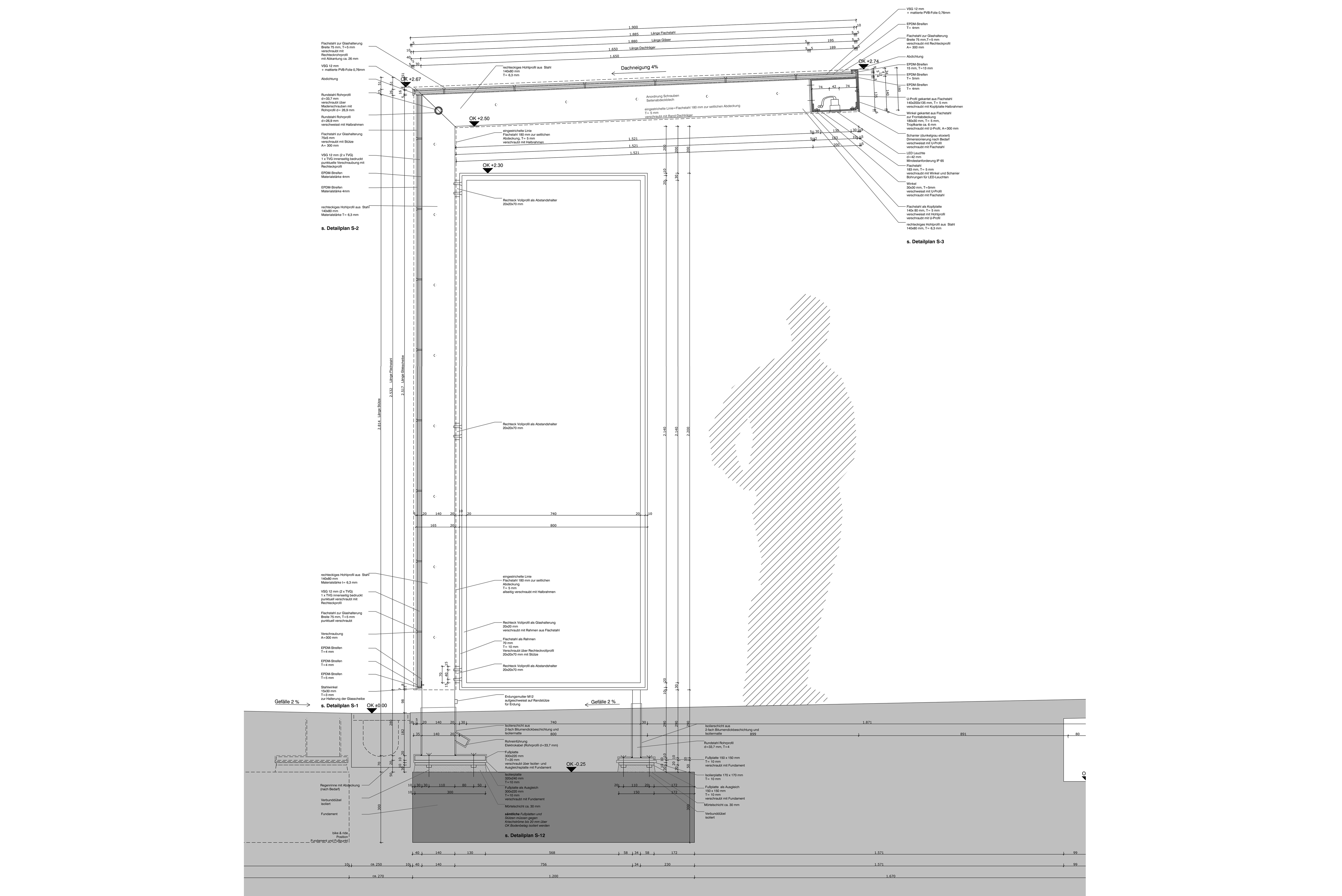 Die Konstruktion ist denkbar einfach: Halbrahmen aus Rechteck-Rohrprofilen im Abstand von 1,20 m stützen die Dachverglasung und die rückwärtige Wetterschutzverglasung. Die Konstruktion benötigt keine Dachrinnen, das Dachwasser fließt über die Gläser der Rückwand ab. Die rückwärtige Verglasung ist mit einem halbabstrakten Schilfmuster bedruckt, die Dachgläser sind mattiert.