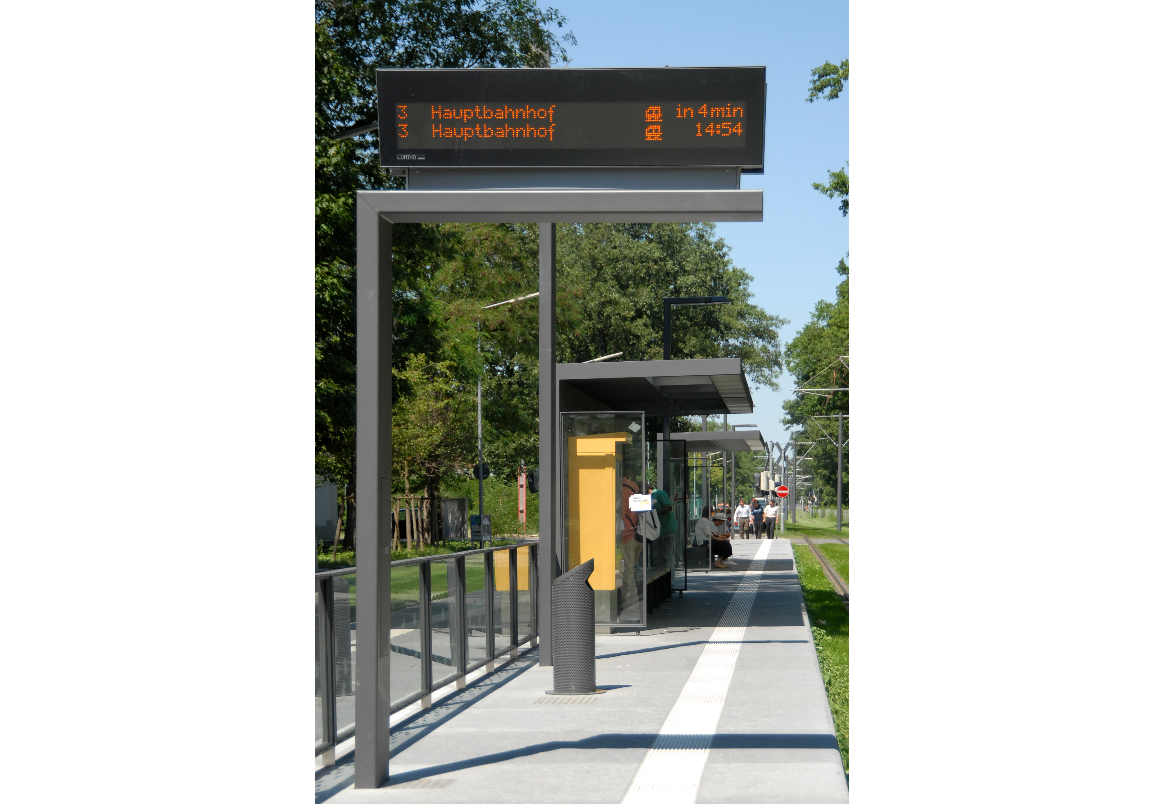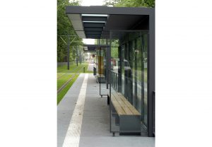 Das Haltestellenmobiliar entwickelt sich aus einem Set einzelner Stahlrahmen mit bedruckten Glasfüllungen. Das Blattmuster der Bedruckung wiederholt sich in geprägter Form auf den Bahnsteigplatten.
