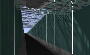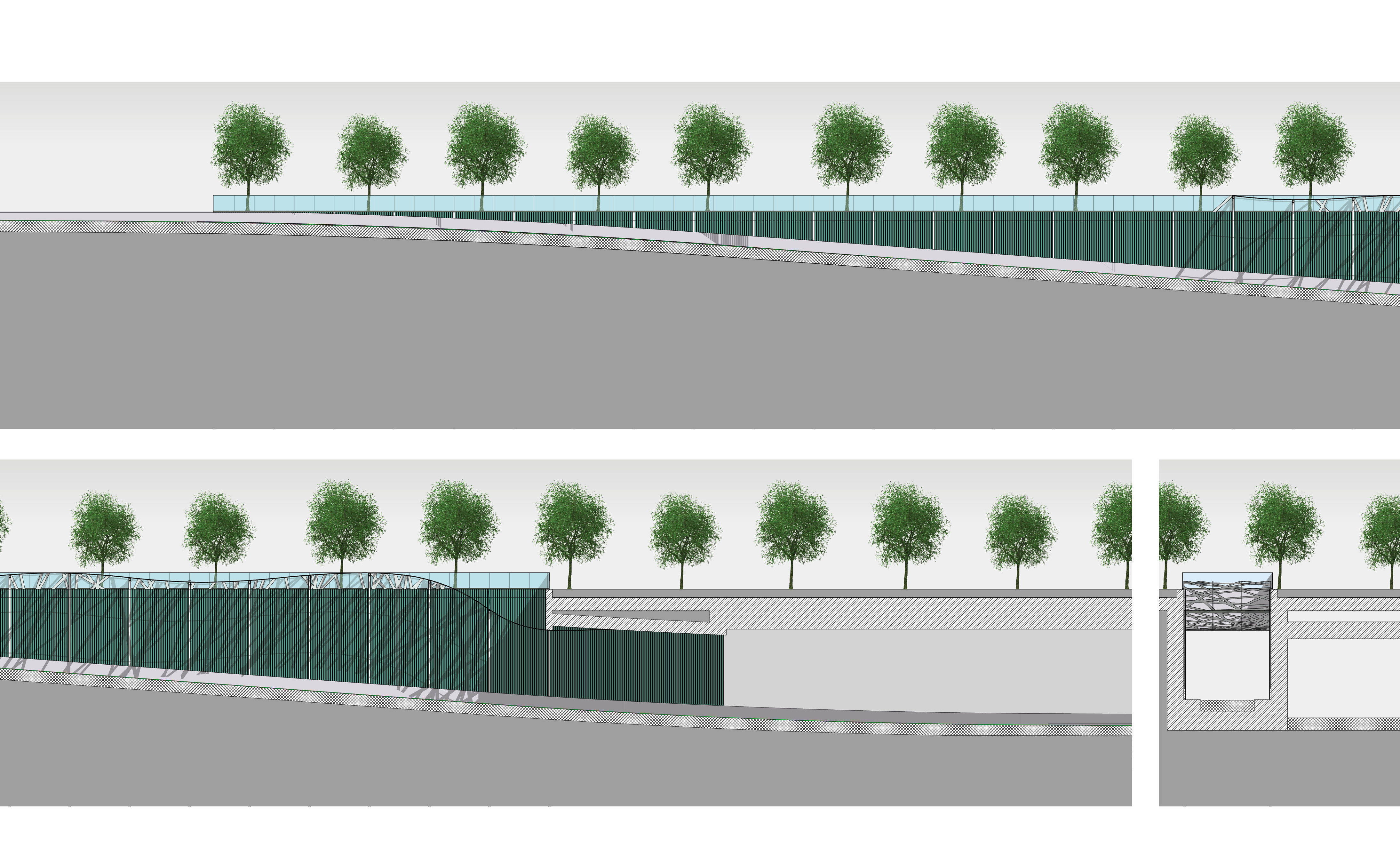 Die Tunneleinfahrten erhalten analog zur Verkleidung / Bänderung des Abluftkamins eine geschwungene Abdeckung, die aus verflochtenen Edelstahlbändern generiert wird. Das Flechtwerk verkleidet und schmückt den am tiefsten gelegenen Teil der Tunneleinfahrt, unterstützt aber auch durch die Verdichtung die Adaption des Auges beim Ein- und Ausfahren. Die Beleuchtung der Abfahrten erfolgt durch seitlich in die Wandverkleidung eingelassene Lichtleisten.