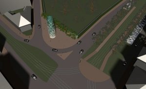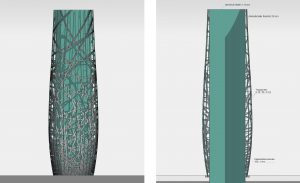 Wir betrachten den Abluftkamin und die Tunneleinfahrten als im Stadtraum sichtbare Teile eines Gesamtsystems. Mit der korrespondierenden Gestaltung des Kamins und der Tunneleinfahrten stellen wir diesen Zusammenhang bildlich dar. Wir begreifen den Tunnel und den Abluftkamin als Lufttransportierende Röhren. Die Gestaltung insbesondere des Kamins greift das Bild sich verwirbelnder Luft auf und transformiert die unsichtbaren Luftströme in ein formgebendes Flechtwerk aus Edelstahlbändern, die die äußere Hülle des Abluftkamins bilden. Auch die geschwungenen Abdeckungen der Tunneleinfahrten lassen mit ihrer Wellenform die Leichtigkeit von Luftströmungen anklingen.