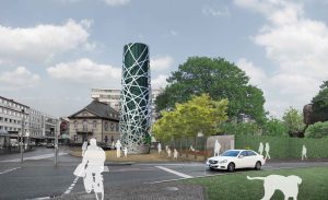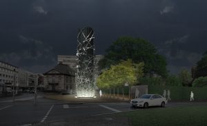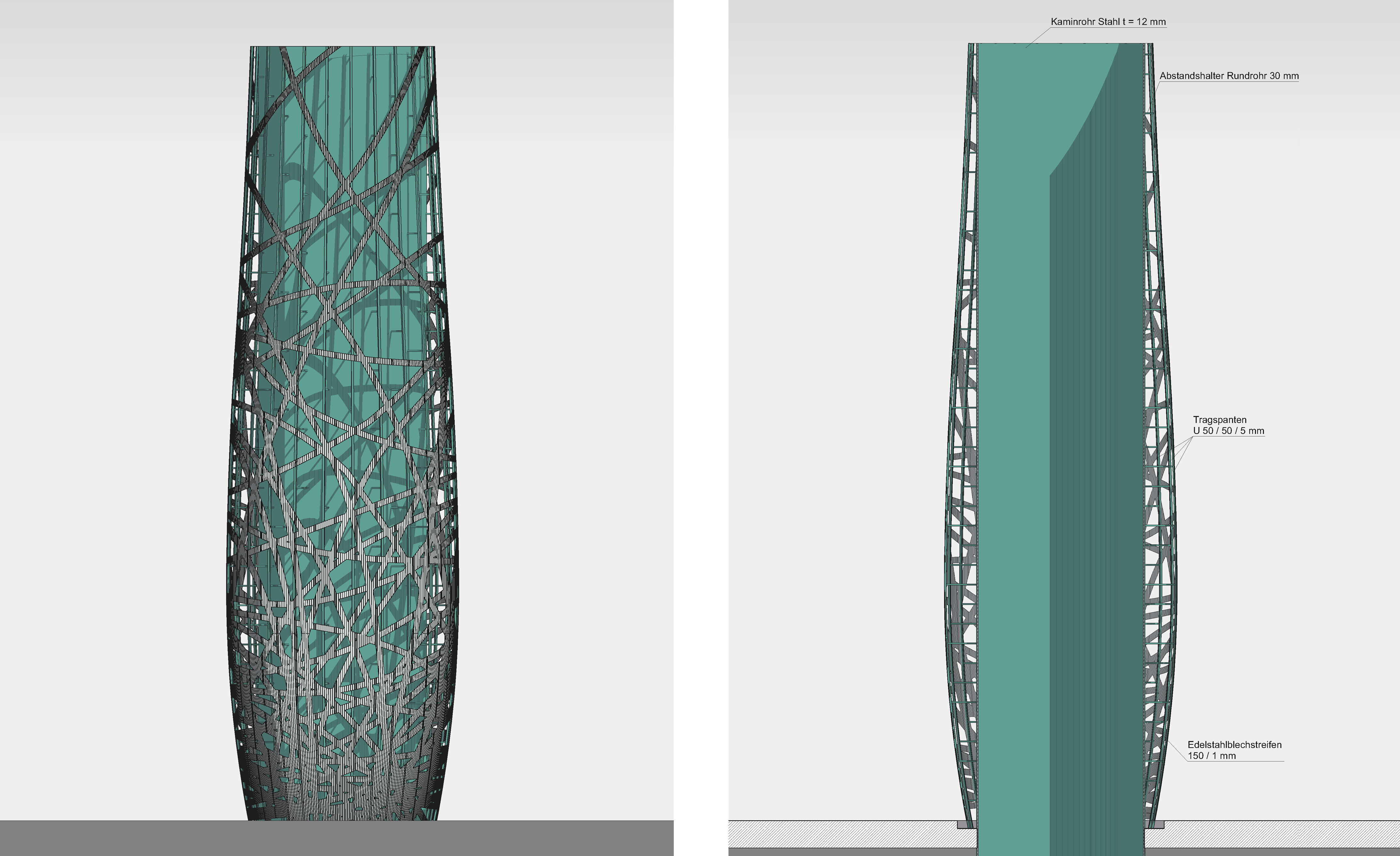 Der Abluftkamin wird als gestaltetes Kunstobjekt auf dem Platz freigestellt. Dem stählernen Kernrohr des eigentlichen Abluftkamins wird eine Schicht aus leicht gebauchten Spanten vorgeblendet. Um die Spanten winden sich ornamental aufgefasste Edelstahlbänder. Das weckt in der so generierten Grundform einerseits Analogien zu bombierten klassischen Säulen, andererseits zu Vasen mit klassischem Fadendekor. Der Kamin gründet in einer kreisrunden Vertiefung des Platzes. Durch umlaufend in den Rand eingelassene LED-Strahler entsteht ein „Lichtsee“, der den dicht umwebten Sockel des Kunstobjekts illuminiert. Zusätzlich spiegeln sich die Lichter der Stadt in den hochreflektierenden Edelstahlstreifen.