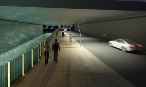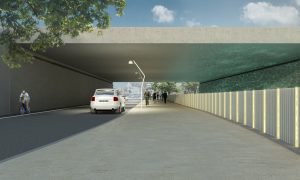 Die neue Raumhülle der Unterführung bleibt unangetastet. Sie wird weder verkleidet noch berührt. Der Charme des Rohbaus wird belassen. Die Geländerstabskulptur wird als eigenständige Figur eingestellt. Sie interagiert als durchlaufendes Rückgrat mit dem statischen Brückenraum.