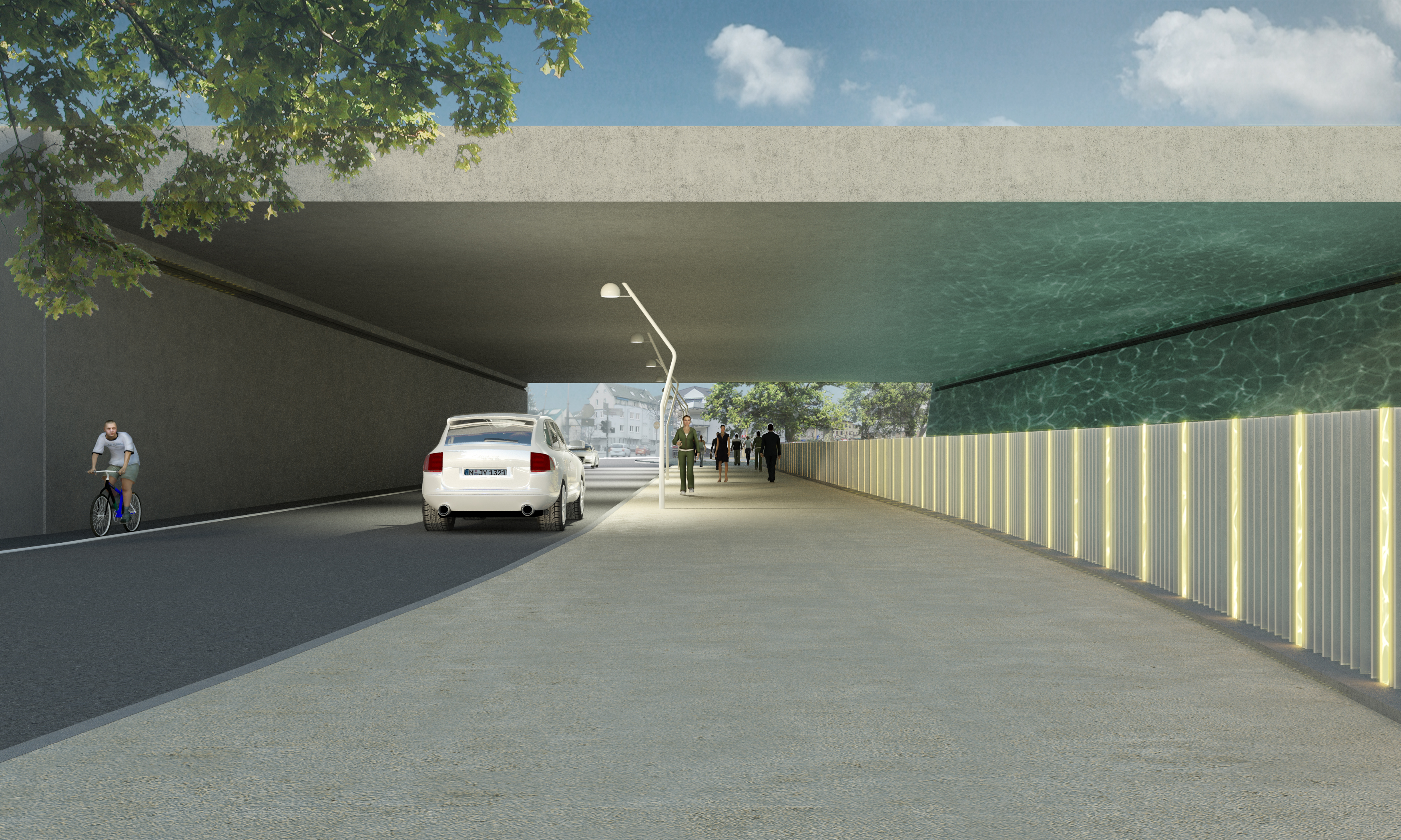 Die Alb ist Ideen- und Taktgeber unserer Entwurfsidee. Wir setzen den schnellen Verkehrsströmen die natürliche Fließgeschwindigkeit der Alb entgegen. Das Wasser wird in seiner anmutigen Bewegung „ins rechte Licht gerückt“. Die projizierten Spiegelungen auf Wand und Decke signalisieren Entschleunigung. Die Wellenbewegung zeigt sich auch als Lichtverlauf im Geländer.