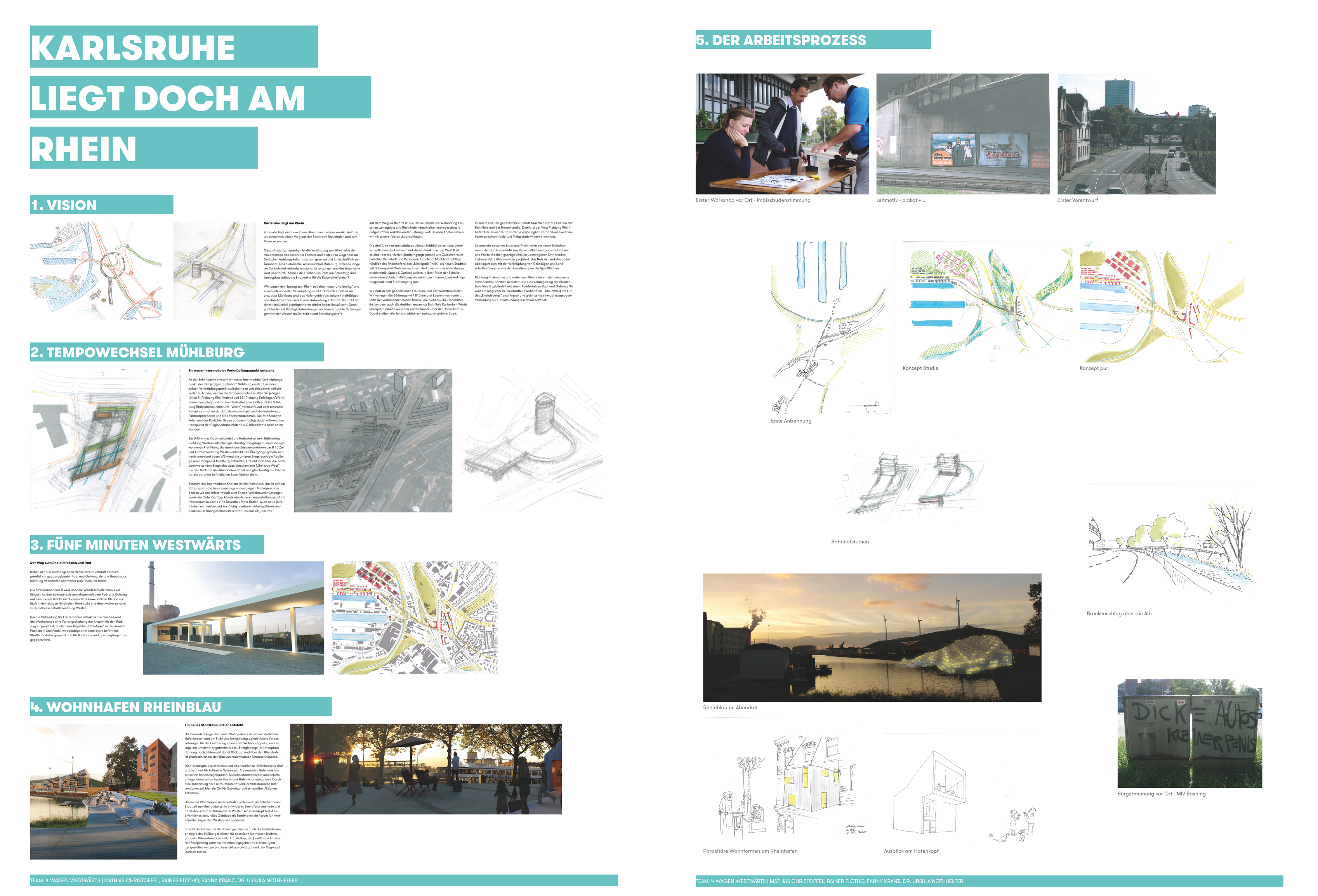 Karlsruhe liegt nicht am Rhein. Aber immer wieder werden Anläufe unternommen, einen Weg aus der Stadt zum Rheinhafen und zum Rhein zu suchen. Einen möglichen Weg zeigt unser Workshop-Beitrag auf. Auf dem Weg westwärts ist die Honsellstraße als Verbindung zwischen Lameyplatz und Rheinhafen durch einen mehrgeschossig aufgetürmten Verkehrsknoten „stranguliert“. Diesen Knoten wollen wir mit unserer Vision durchschlagen.
