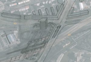 Wir nutzen den gedanklichen Freiraum, den der Workshop bietet: Wir verlegen die Südtangente / B10 um drei Ebenen nach unten. Statt der vorhandenen hohen Brücke, die nicht nur die Honsellstraße, sondern auch die darüber kreuzende Bahnlinie Karlsruhe – Wörth überquert, planen wir einen kurzen Tunnel unter der Honsellstraße. In einem zweiten gedanklichen Schritt tauschen wir die Ebenen der Bahnlinie und der Honsellstraße. Damit ist der Weg Richtung Rheinhafen frei. Gleichzeitig wird die ursprünglich vorhandene Geländekante zwischen Hoch- und Tiefgestade wieder erkennbar.