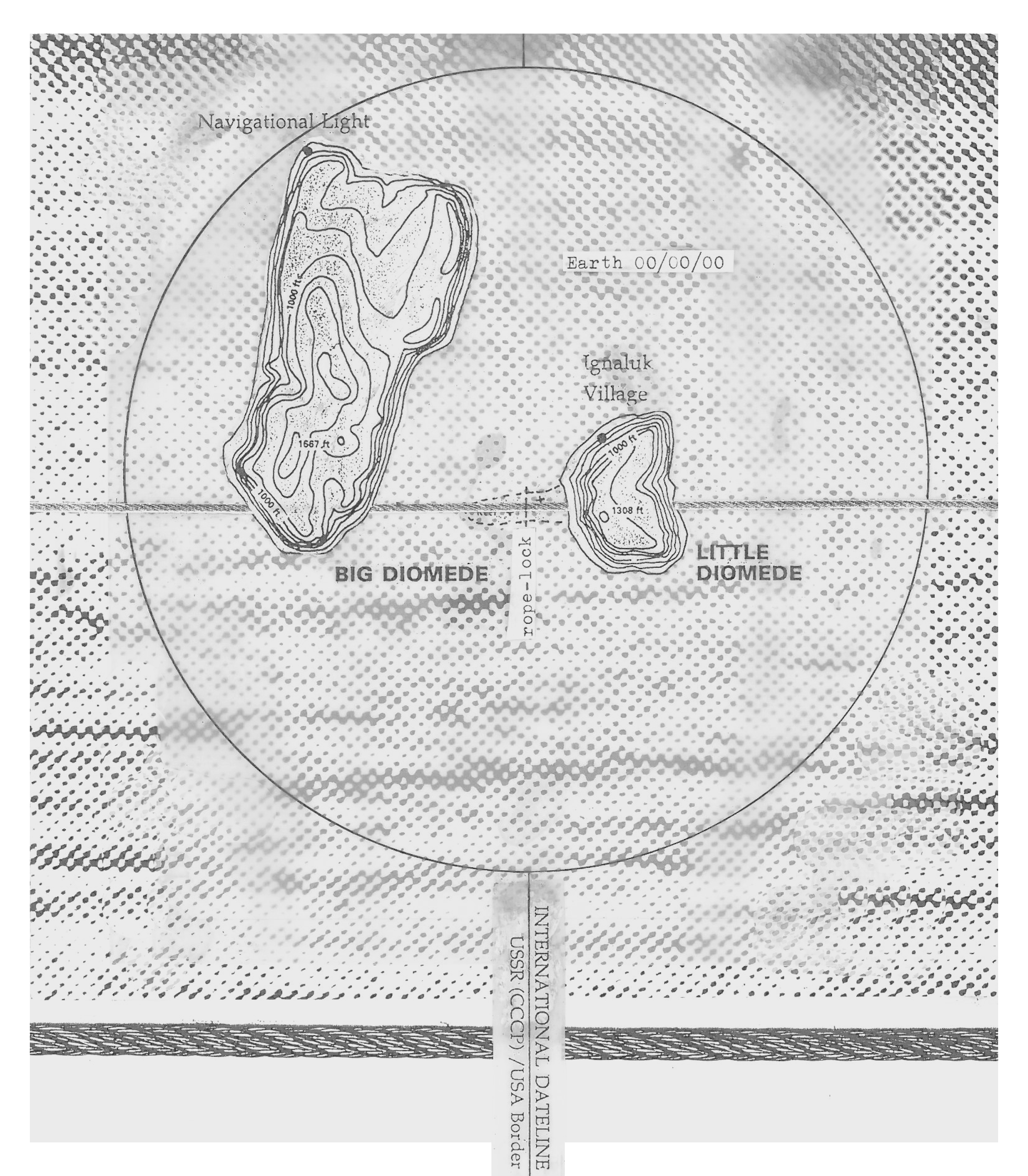 In the sphere of the Diomede Islands the dateline/ boarder is splitted, a district is generated, where time, nationalities, religions and ideologies don’t exist. So this district contains the key for world-wide peace. The district is called „Earth 00/00/00“